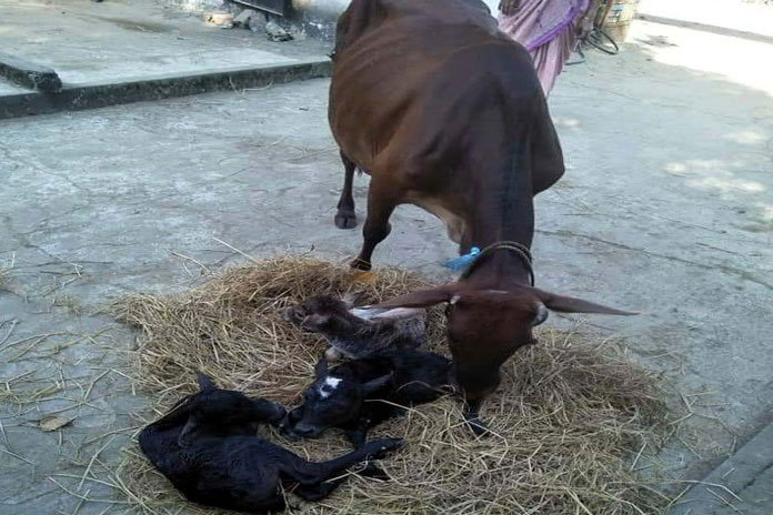 গতকাল শুক্রবার রাতে সিলেটের বিশ্বনাথ পৌরশহরের শাহজিরগাঁও গ্রামে একটি দেশি গাভি এক সঙ্গে তিনটি বাছুর প্রসব করেছে। গাভির মালিক ওই গ্রামের যুক্তরাজ্য প্রবাসী সালেহ আহমদ।